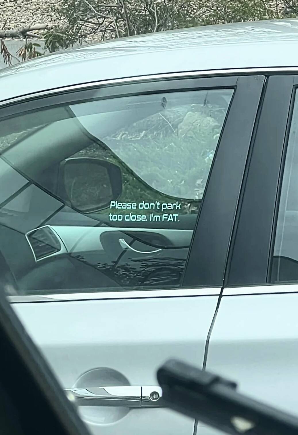 Finally, some honesty from a car window. This is peak self-awareness and I honestly respect it. We should all be as up-front with our parking situation. Maybe fewer door dings, maybe more laughter.