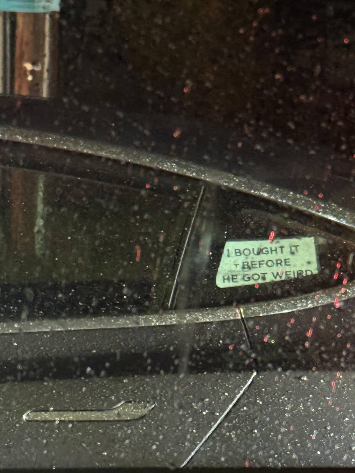 “I bought it before he got weird.” That’s the energy I’m bringing to every questionable purchase from now on. Nothing says car pride like disclaiming your owner loyalty—just in case anyone gets the wrong idea at a red light.