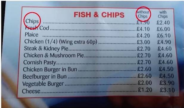 Fish and chips—hold the chips. If you need a menu to both clarify and confuse, this one’s for you. Please tell me someone actually tried to order chips without chips. Extra points if the cashier didn’t even blink.