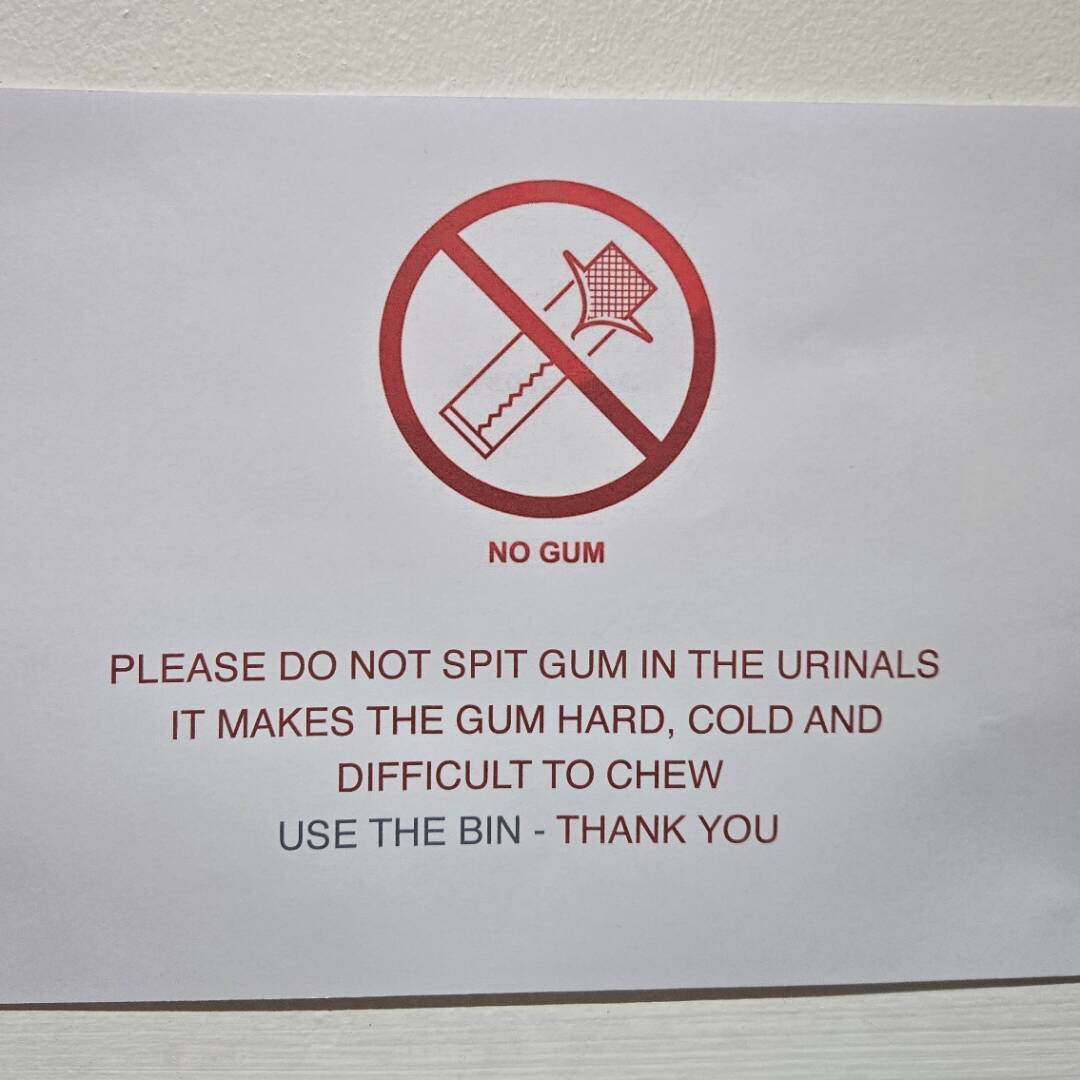 Well, that escalated quickly! British pubs never disappoint with their toilet humor—this one serves up snark with a splash of public health advice. Who knew spitting gum could lead to such hardships? Somewhere, dentists are quietly applauding the honesty.