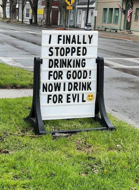Turning a phrase so smoothly, this drinks sign graduates from ‘dad joke’ into comic legend territory. If you’re not drinking for good anymore, at least do it with some mischief and style. Cheers to that!