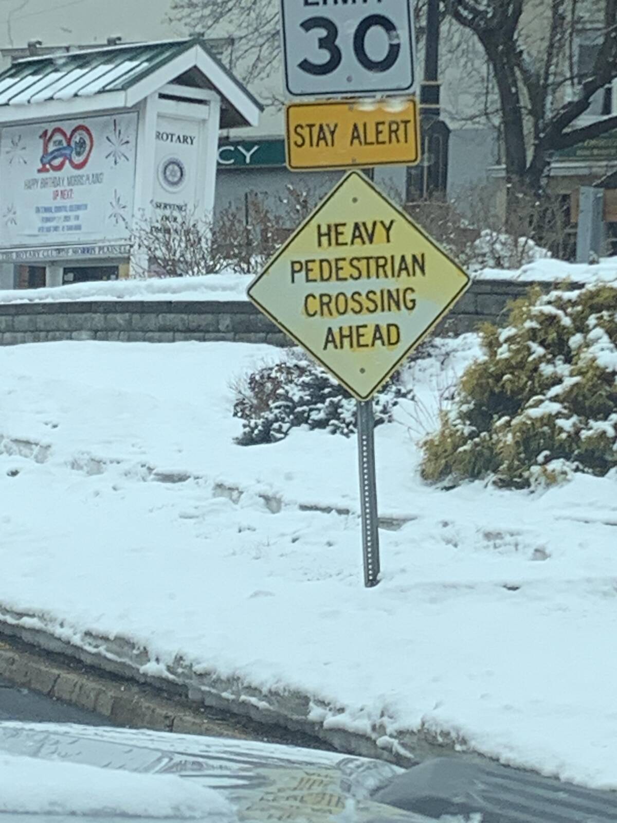 That sign could really use a comma. Either we have to dodge some pretty sturdy folks or the heaviest pedestrian in history is making regular crossings. Stay alert, they say—my eyes are peeled for giant footfalls now. Grammar saves lives!
