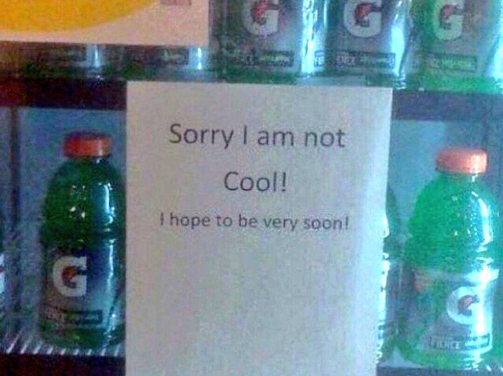 This is the most relatable thing I’ve seen taped to a fridge. Don’t worry buddy, we’ve all had days when we’re just not cool enough for this world (or the mini fridge). At least this drink has hope and aspirations. Never give up!