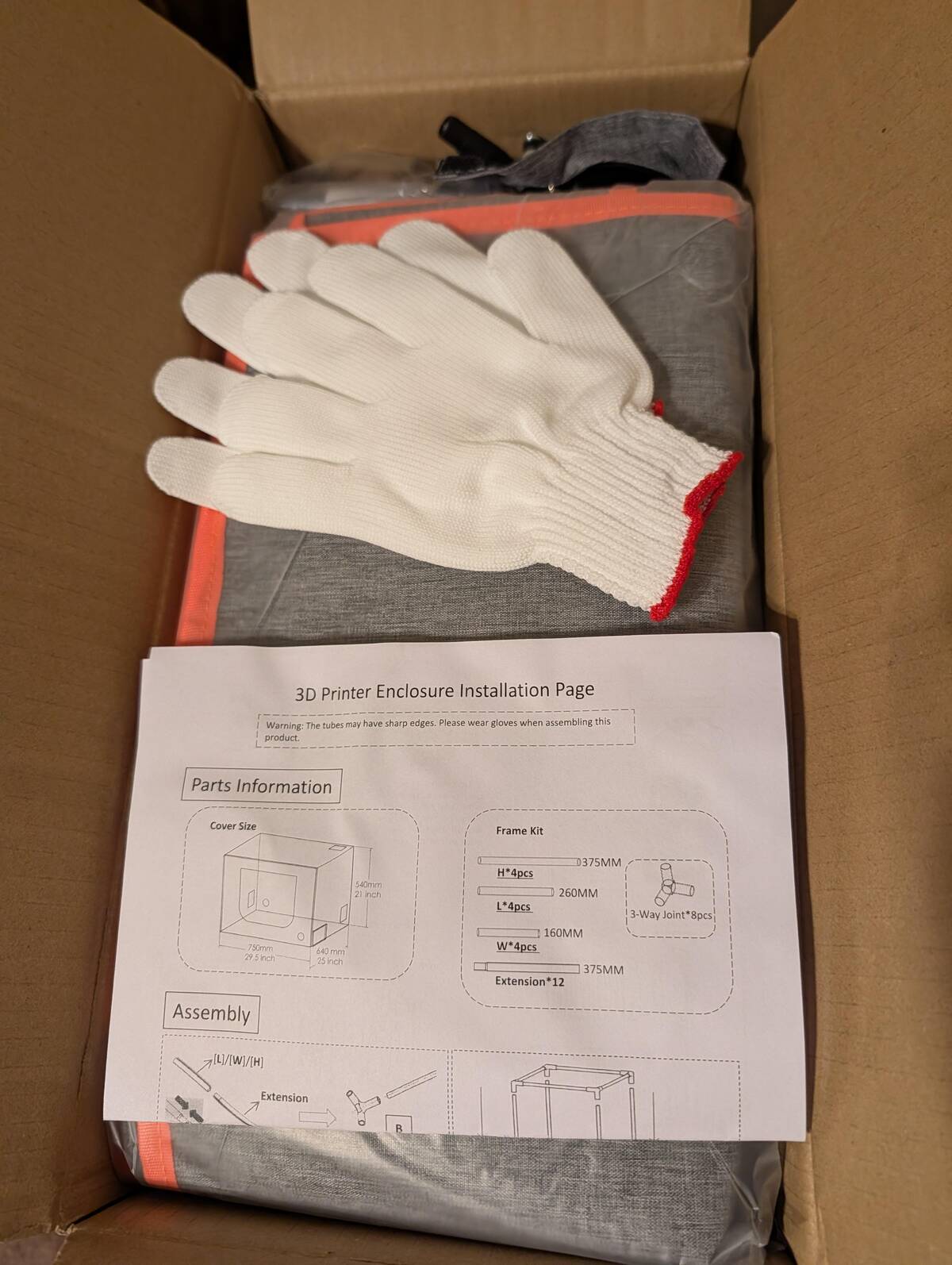 You know your 3D printer enclosure is serious when it comes with gloves. That’s a level of assembly warning I can respect. Time to suit up—it’s about to get sharp in here.