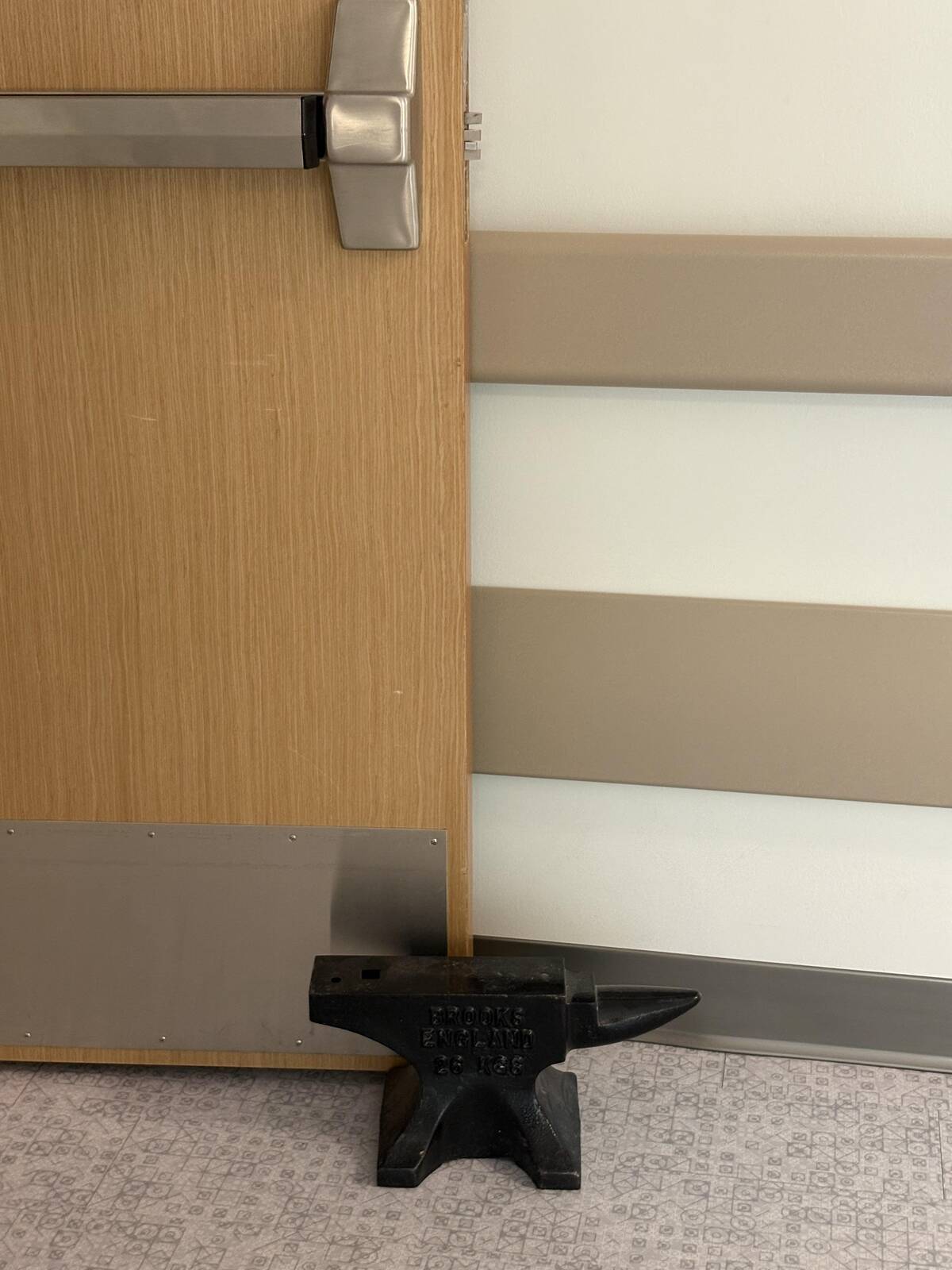 That is the most unmovable door in the building. Whoever decided on an anvil for a doorstop is taking the phrase ‘not going anywhere’ a bit literally. Bonus points for old-school flair.