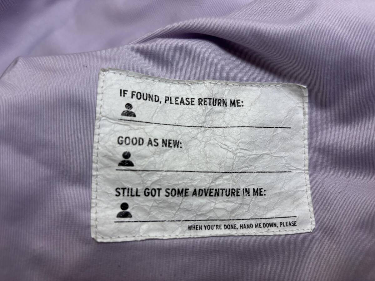 Now that’s a jacket label with some personality. If found, please return—plus ratings for ‘good as new’ or ‘still got adventure’! Jackets deserve a little love, too; let’s normalize the long life of outerwear.