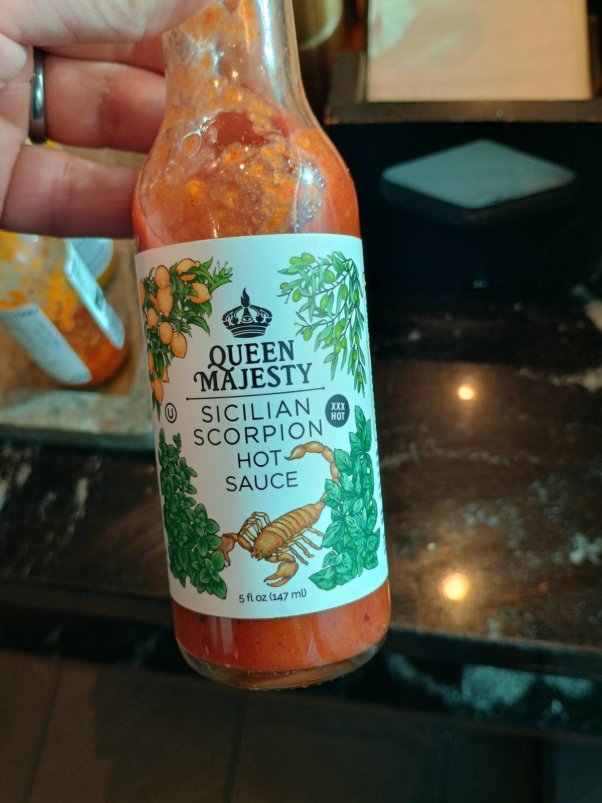 Breakfast…and immediate regret? An 800,000 Scoville unit hot sauce, just casually waiting by the bagels. Imagine putting that on your eggs thinking it was mild. That’s definitely a bold move for anyone feeling brave before a flight!