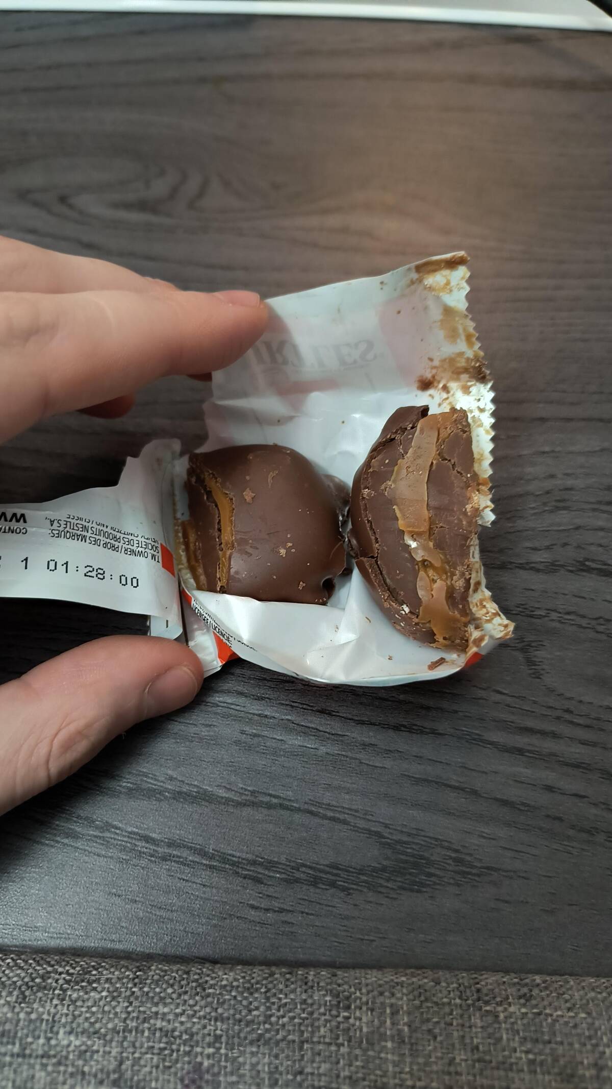 “Chocolate Turtle cut in half by the machine that wrapped it.”