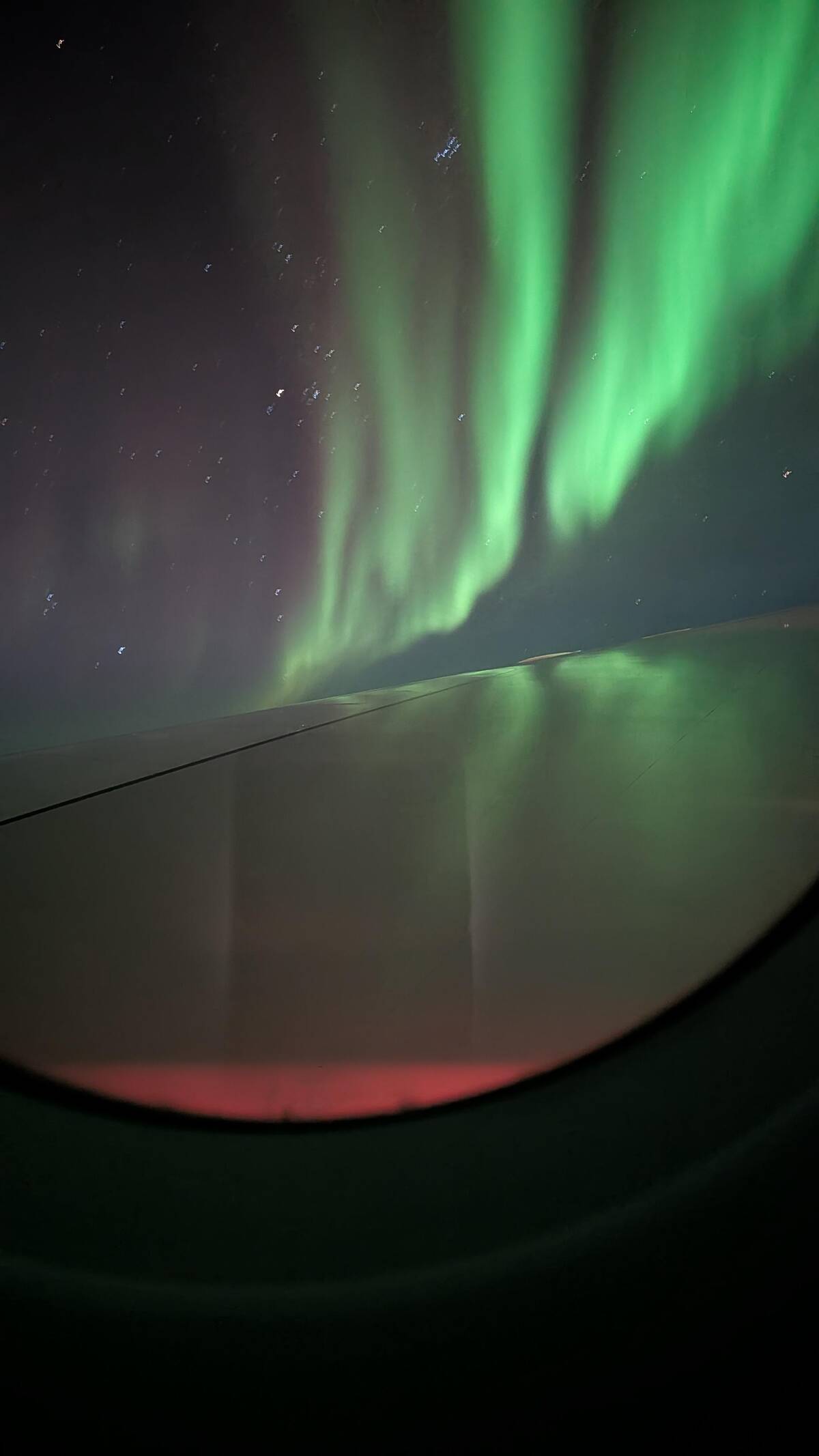 Whoa, talk about the most amazing in-flight entertainment you could get—an actual view of the Northern Lights right from your plane window! That green glow looks absolutely unreal. Bet that made the whole flight feel extra special. Some things you just can’t get from a movie screen.