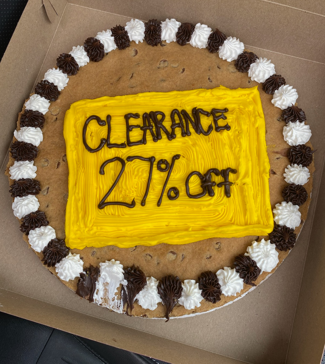 Nothing says tempting dessert like a cookie declaring its own discount! The smeared edge just adds to the authentic bargain vibe here. If you’ve ever wondered what clearance tastes like, this cookie’s got you covered. Presentation might be questionable, but at least the savings are real.