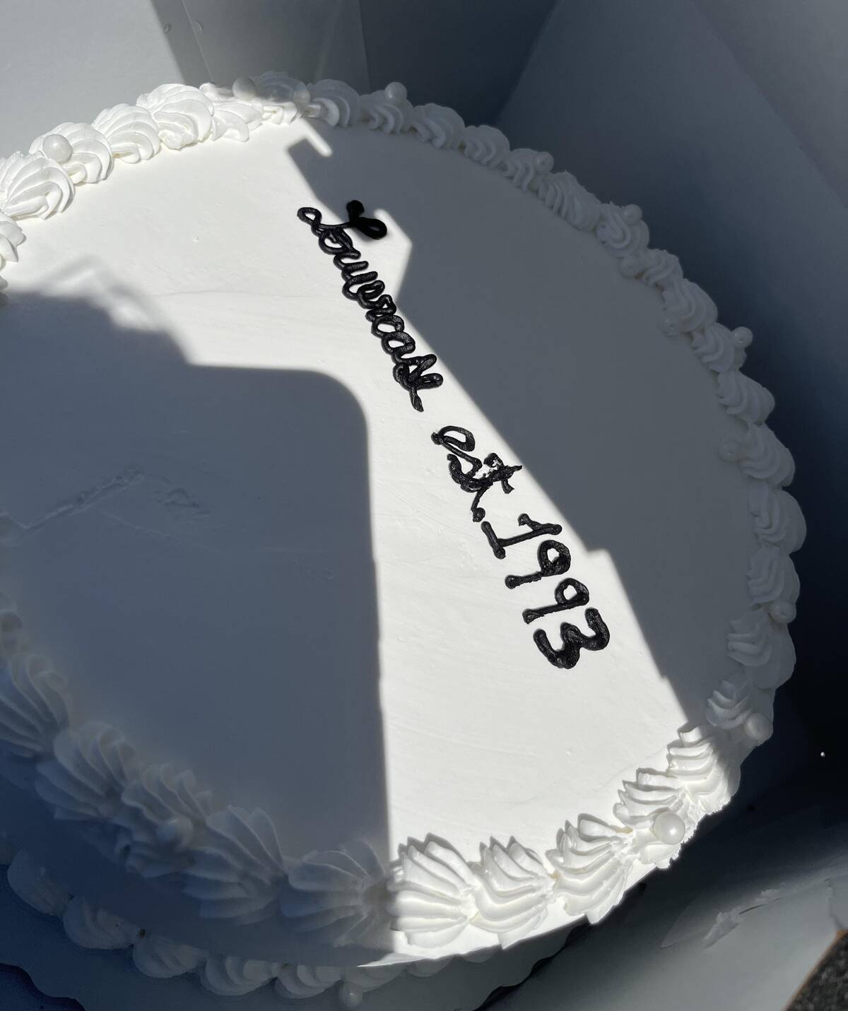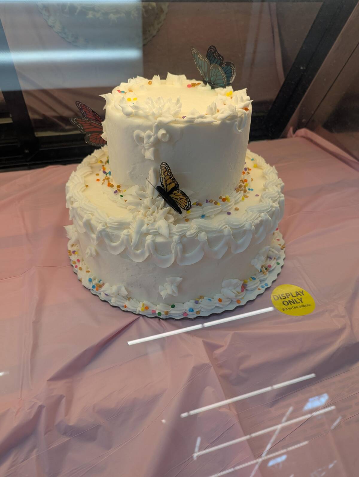 There’s a certain charm in a grocery store display cake decorated with butterfly toppers and a squiggle cascading fearlessly down the side. You know it’s extra special when the best detail is so random it has to be called out. Is it modern art or just out-of-practice piping?