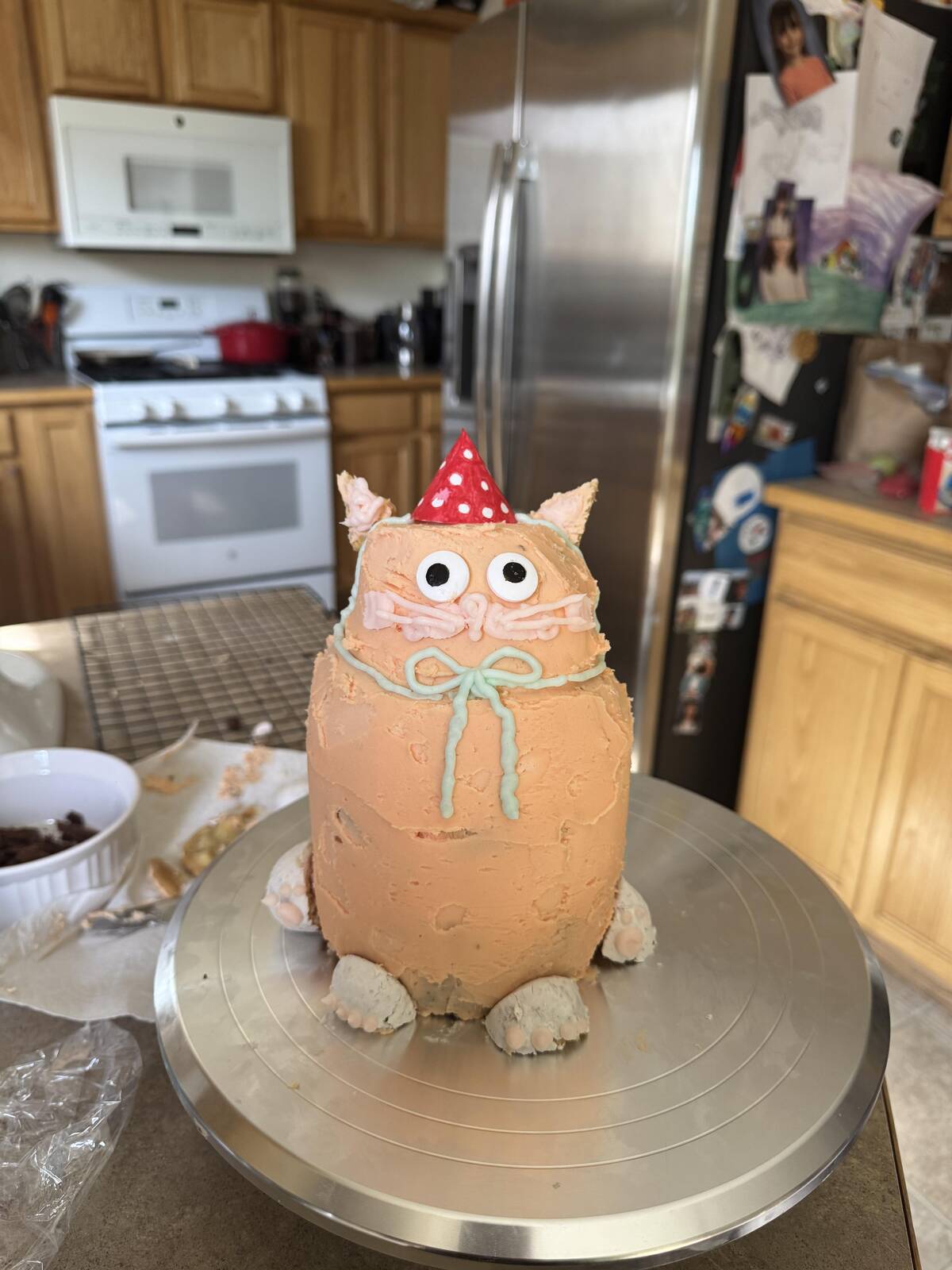 Okay, but I can’t stop looking at those wide eyes! Is it supposed to be a cat or did a potato with a party hat come to life in this kitchen? At least you know this cake is bringing major personality to the party. The little bow just seals the deal—adorable or slightly unsettling? Jury’s out.
