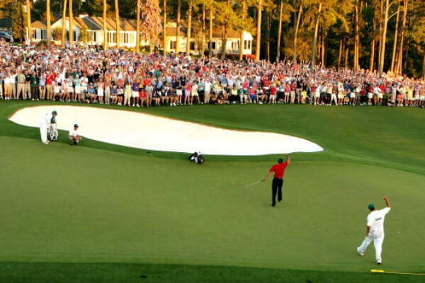 This is the most iconic moment in Tiger Woods’ career. On the 16th hole, Woods made an incredible putt, aiming 20 feet to the left of the hole. He used the sloping green to run the ball towards the hole.