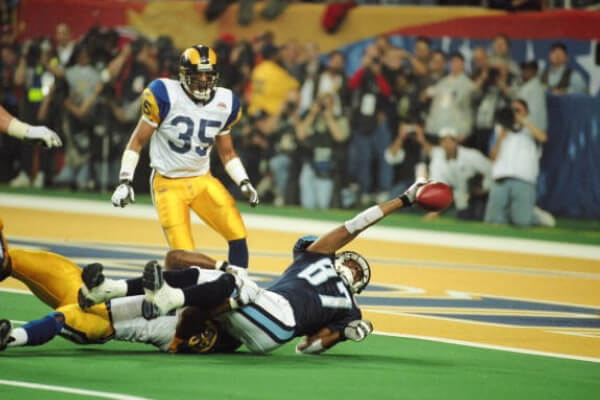 The “Greatest Show On Turf” marched all the way to Super Bowl XXXIV. In that game, Kurt Warner’s Rams outlasted the Tennessee Titans. Linebacker Mike Jones managed to ground Titans wide receiver Kevin Dyson at the one-yard line.