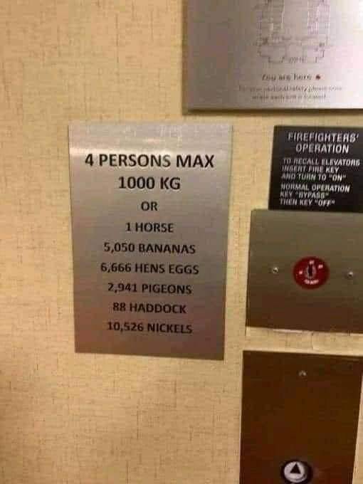Who knew elevator weight limits could be so entertaining? Four people, or a horse, or 88 haddocks—the possibilities are endless, if not a little fishy. Next time you get in a lift, wonder how many bananas you weigh. The math may not add up, but the humor definitely does.