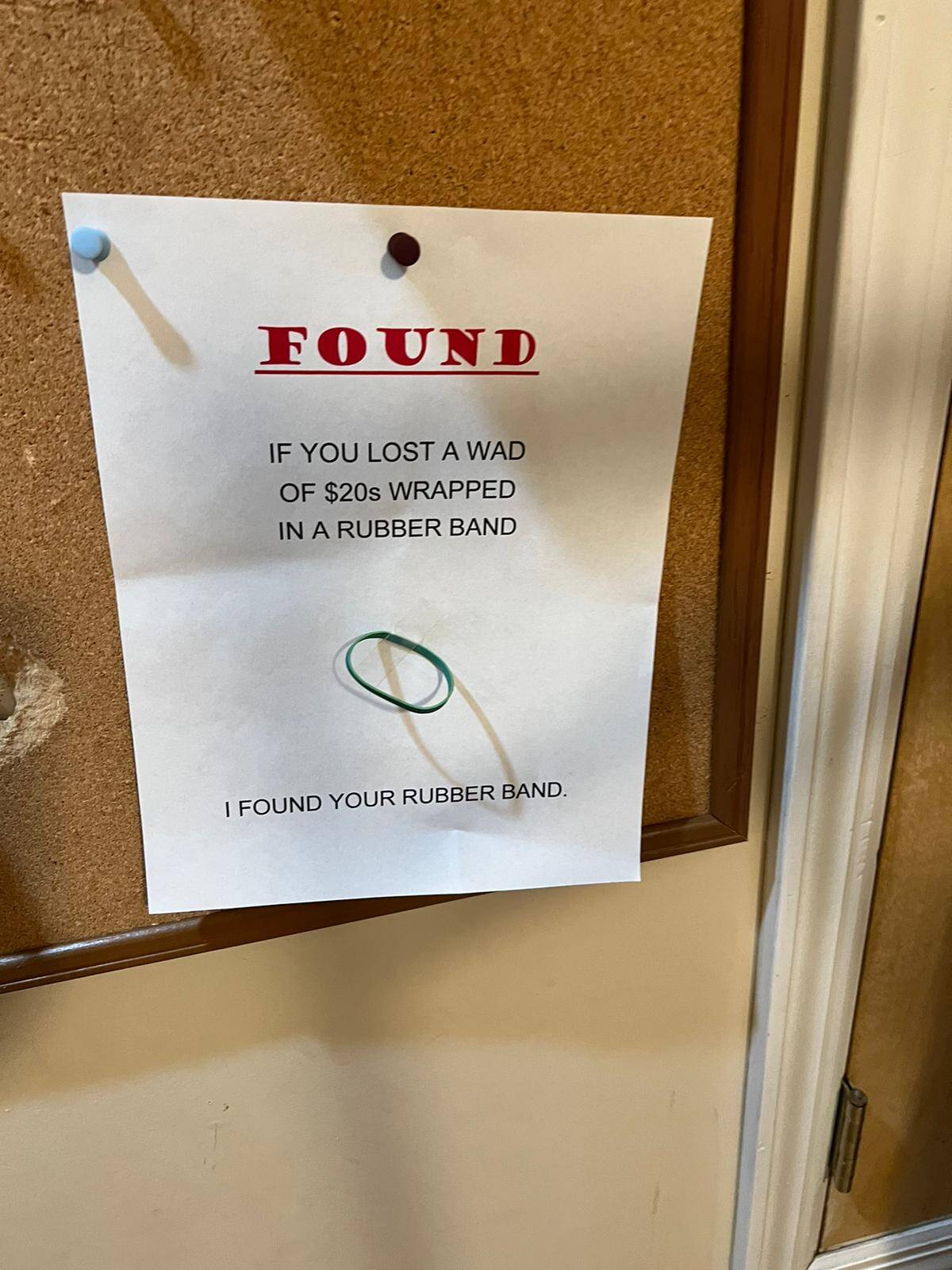 If you lost a wad of $20s wrapped in a rubber band, rejoice: your rubber band has been found! This is either peak trolling or peak honesty. Now, about the cash…let’s hope the rubber band wasn’t holding anything too valuable. At least someone’s keeping an eye out for lost property.