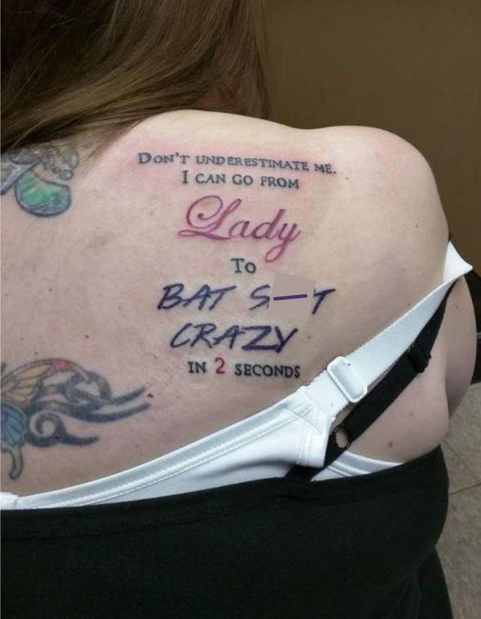 And finally, I present to you this woman, who decided to tattoo on her back and shoulder just how batty she can get. She might think she’s being edgy, but really she’s just putting a giant neon sign over her that says “STAY AWAY”.