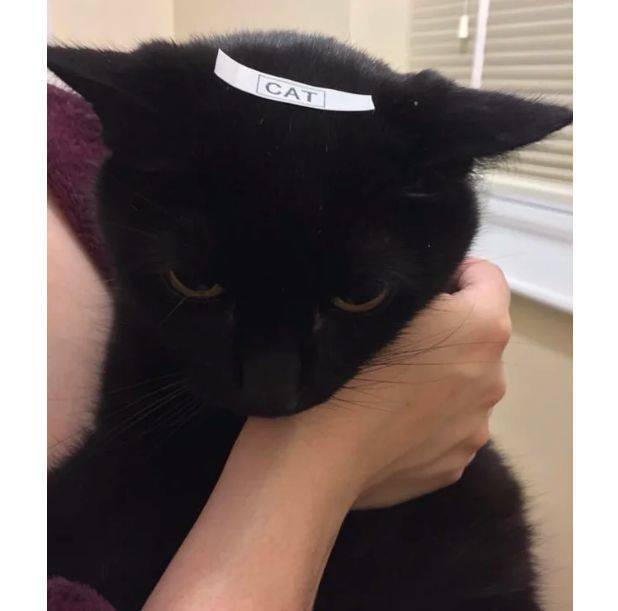 We all know that this is a cat, but the label does look pretty cute sitting on his head.