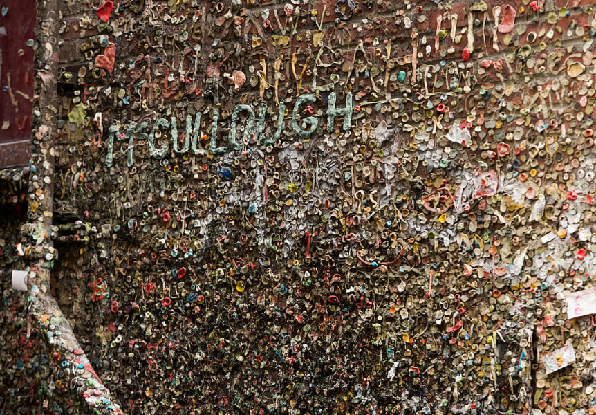 The Market Theater Gum Wall is covered several inches thick, and is 15 feet high, extending 50 feet.