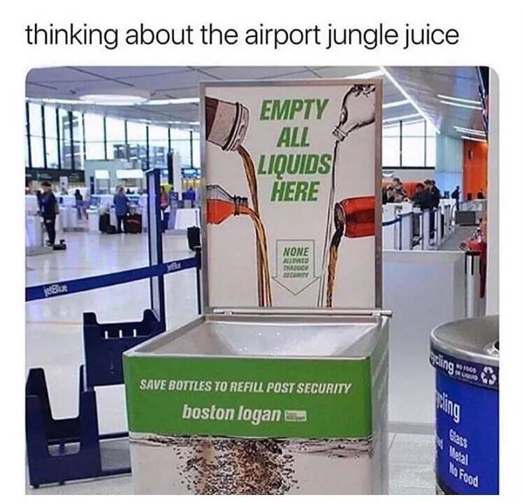 Not sure if I’m more intrigued or horrified by what might actually form if someone mixed all those pre-security liquids together. The true recipe for airport jungle juice may just exist in that bin. If anyone ever says they miss airport cocktails, just show them this picture and see if their tune changes.
