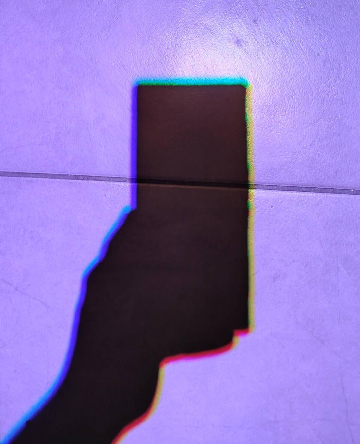 “Trippy lights in bathroom add glitch outline to shadows.”
