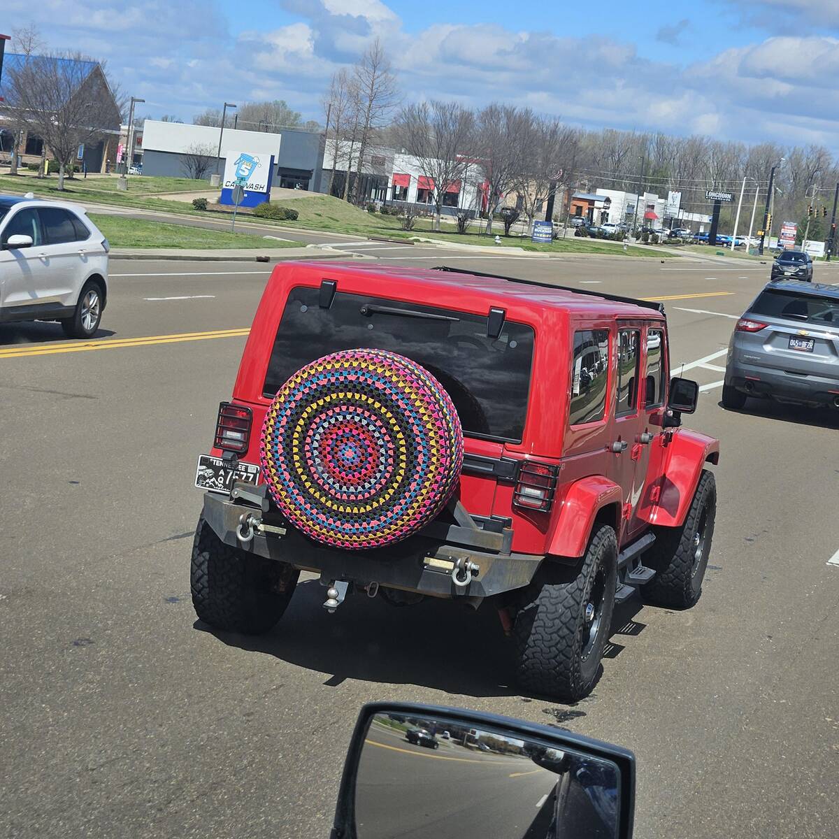 Wow, that’s a wheel cover with major flair! Someone’s ride got a big infusion of personality—and maybe a touch of grandma’s favorite knitting. I’d almost feel bad if this got muddy, it’s basically mobile crochet art at this point. Style at every turn!