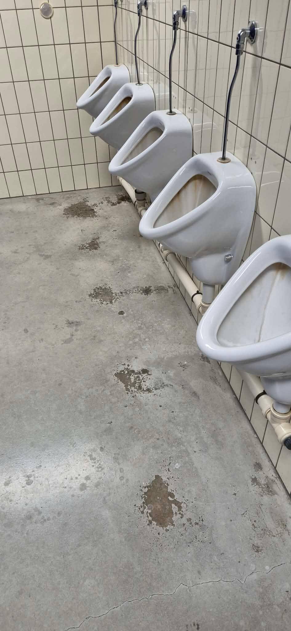 The worn spots on this bathroom floor have a lot to say about unspoken urinal etiquette. It’s like a map of where not to stand! Amazing how people’s habits leave literal marks. Sociology, but make it bathroom-themed.