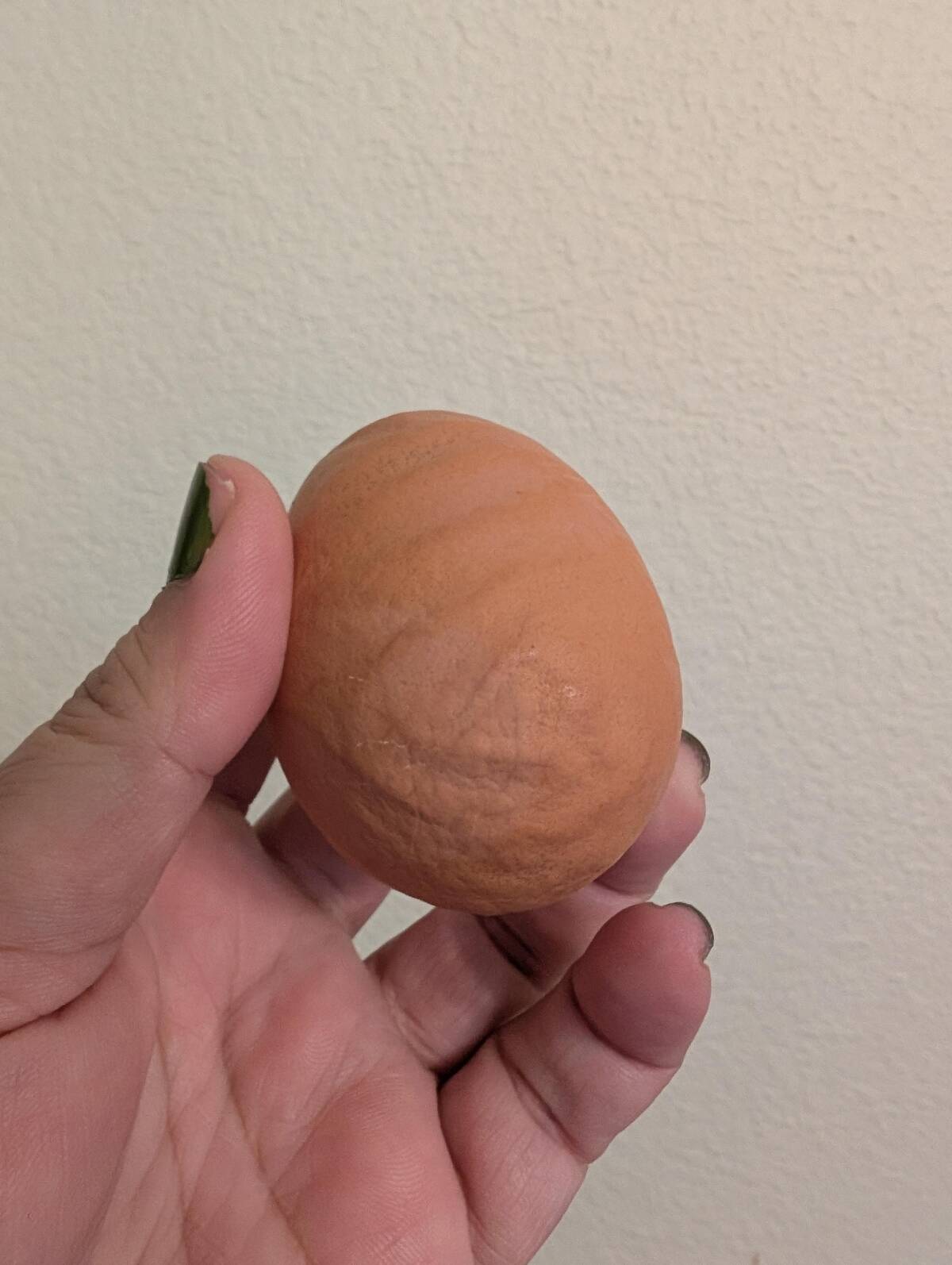 Is that an egg or did someone swap it out with a tiny, brown, wrinkly dinosaur egg? So many ridges—nature’s texture experiment! It almost looks too interesting to crack. Part of me wonders what kind of chicken is out here making abstract sculptures.