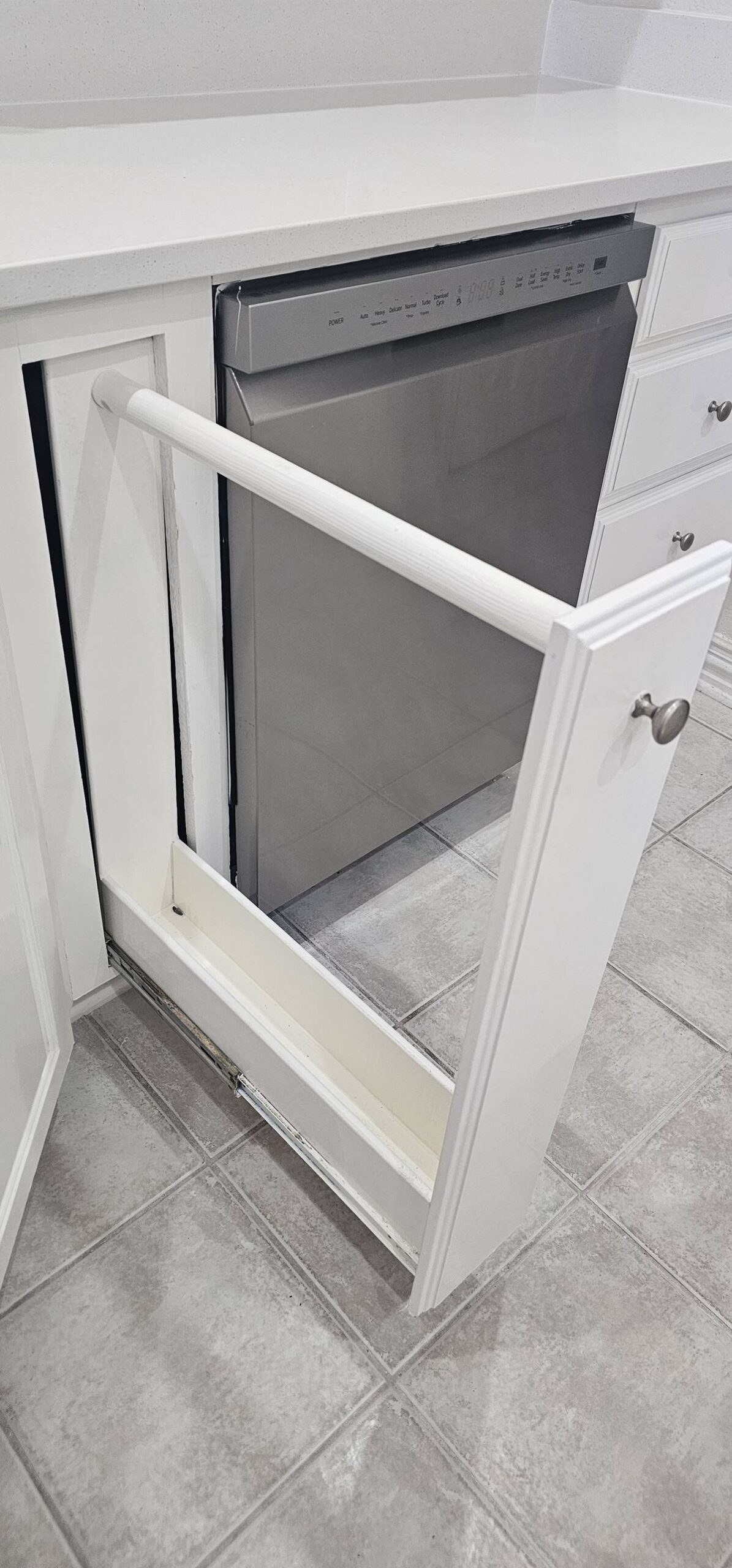 Okay, this cabinet has left me scratching my head—why the dowel at the top and the shallow shelf at the bottom? Is this for hanging towels, drying pasta, or storing your most niche kitchen equipment? Whoever designed this had something special in mind, that’s for sure.