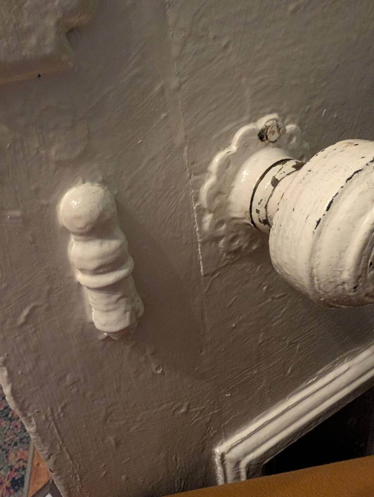 Now here’s an oddball detail—what is that round, bumpy nodule next to the doorknob? It looks like it’s been painted over about twenty times too many. I can’t help but wonder if it’s some Victorian house secret or just an ancient coat hook lost to history.