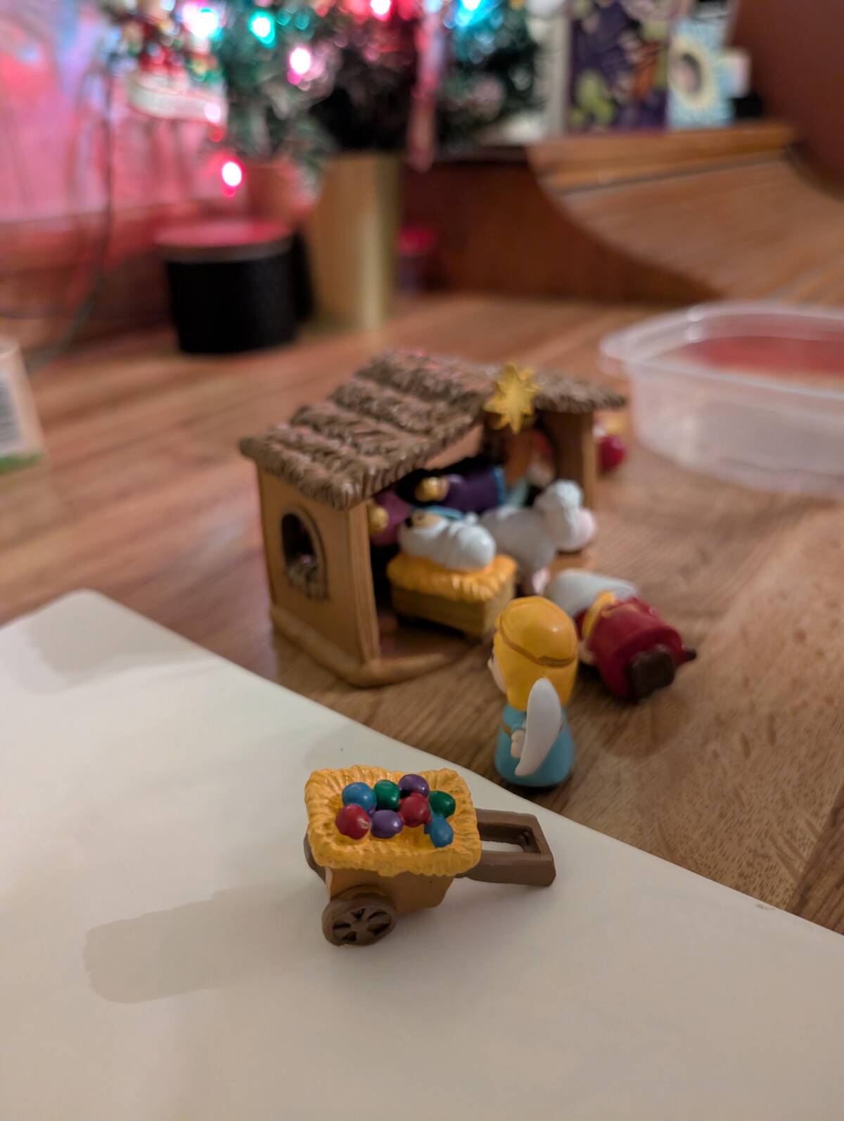 “Wheelbarrow with colorful objects in children’s nativity scene”