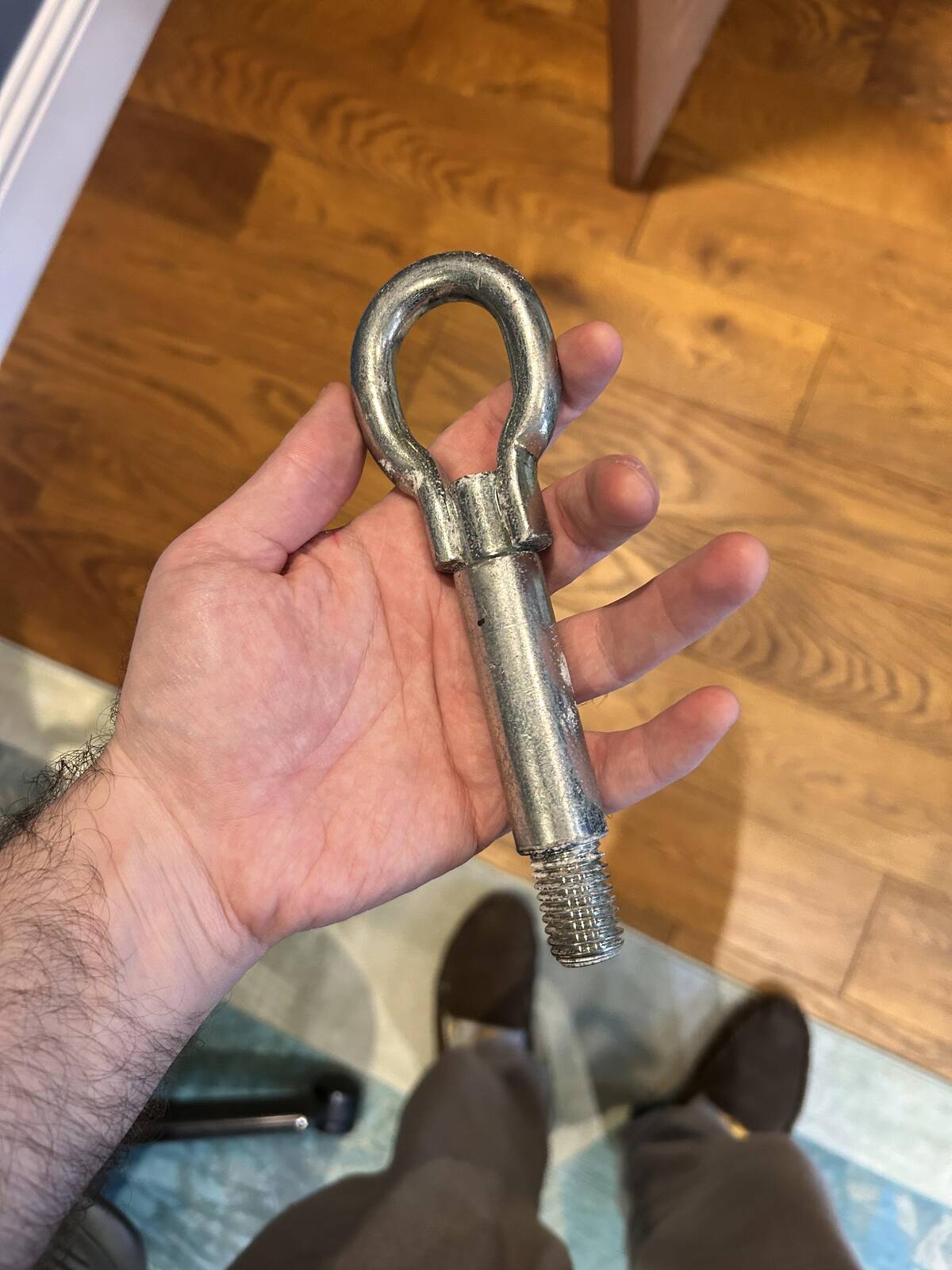 Finding this heavy metal loop left behind in the car after repairs is one way to spark a mini detective story. Part of the engine or someone’s overzealous keychain? Either way, it looks way too robust to misplace—definitely going in the ‘mystery parts’ drawer for now.