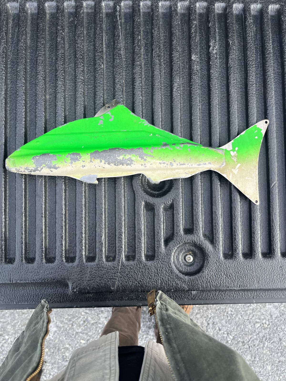 This gigantic, battered metal fish looks like it means business! Is it a novelty fishing lure or perhaps some industrial mystery tool? Either way, I don’t think I’d want to cast this from a fishing line unless I was aiming for a whale—and hoping it had a sense of humor.