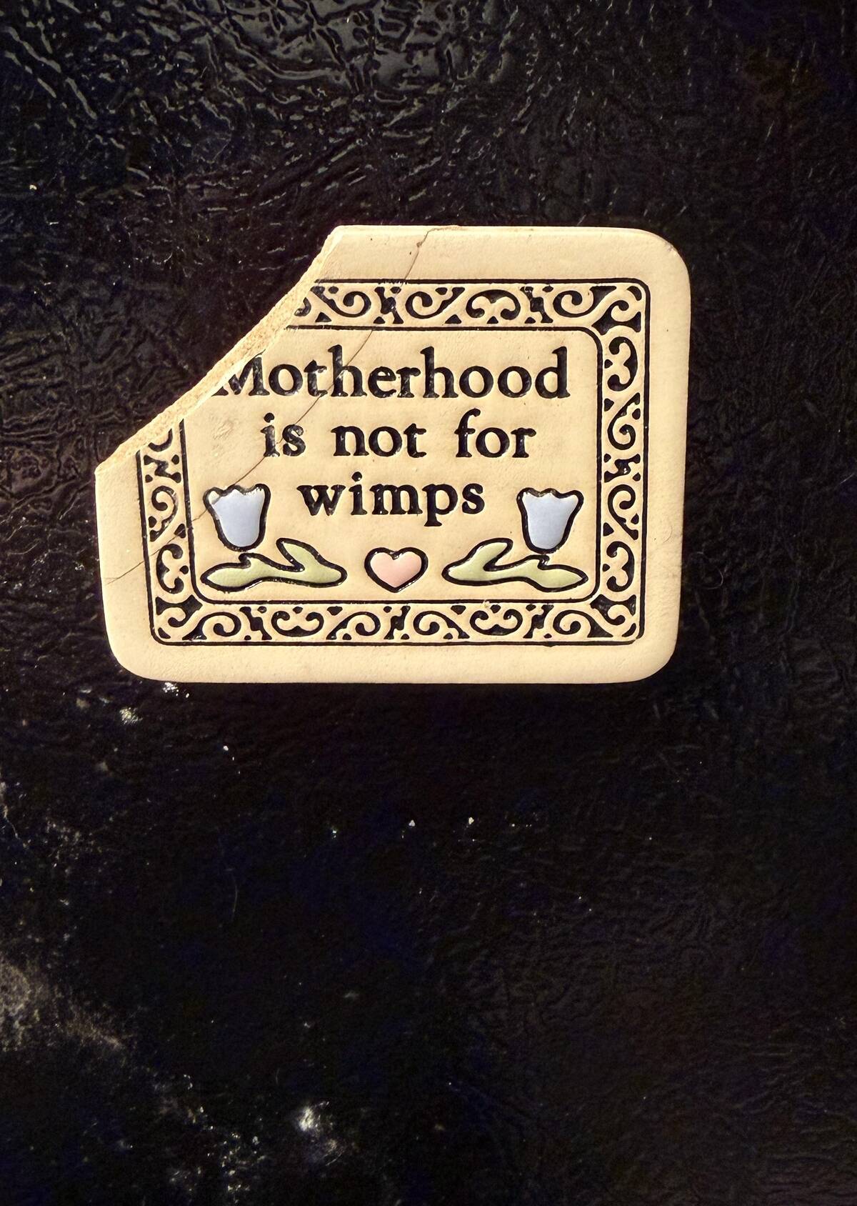This “Motherhood is not for wimps” magnet looks like it really means it. Chipped, faded, but still tenaciously hanging on. The ultimate mom badge for a fridge—braving years of sticky fingers, splattered spaghetti sauce, and questionable science experiments.