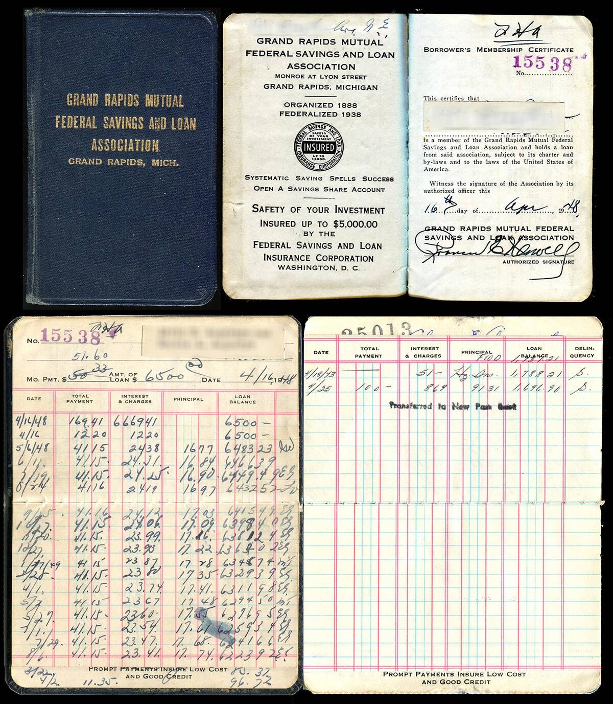 “Payment records from 1945 to 1973 for $6,500 home loan (spans 3 books)”