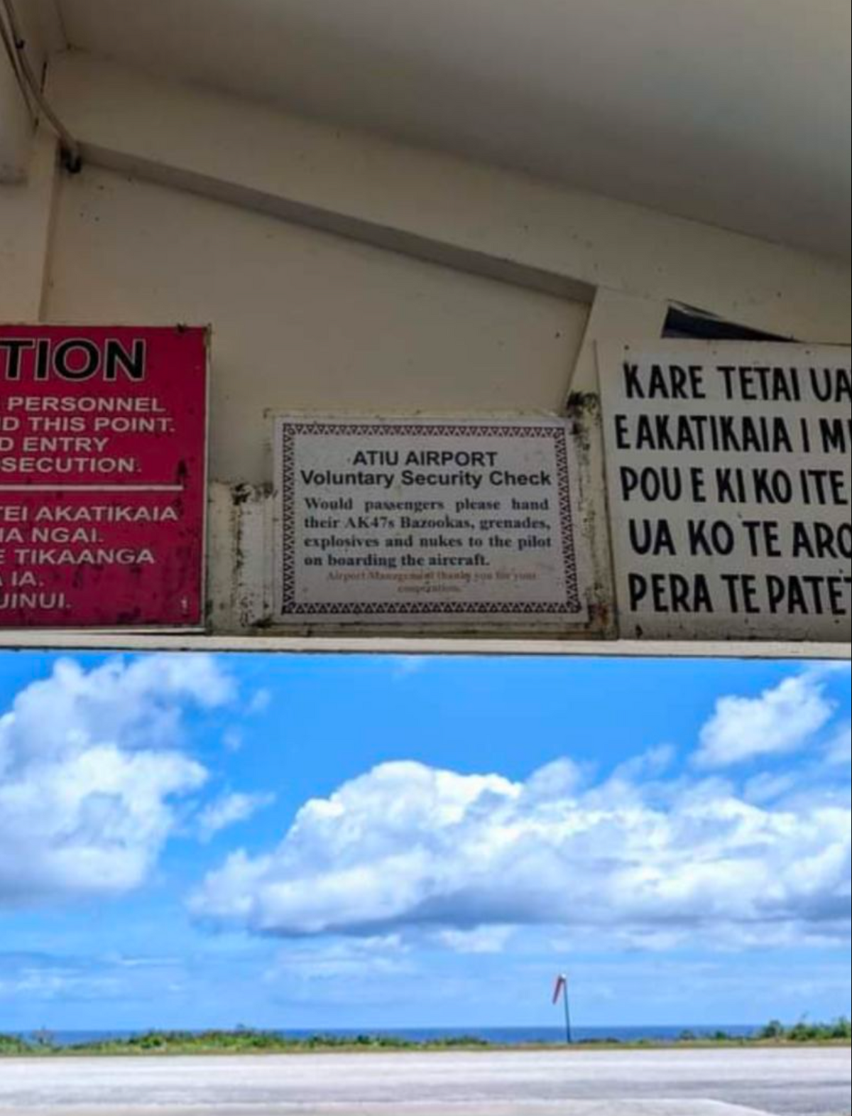 “Airport Security? Atiu (pronounced like a sneeze) in the Cook Islands. Fortunately I handed in all my nukes..”
