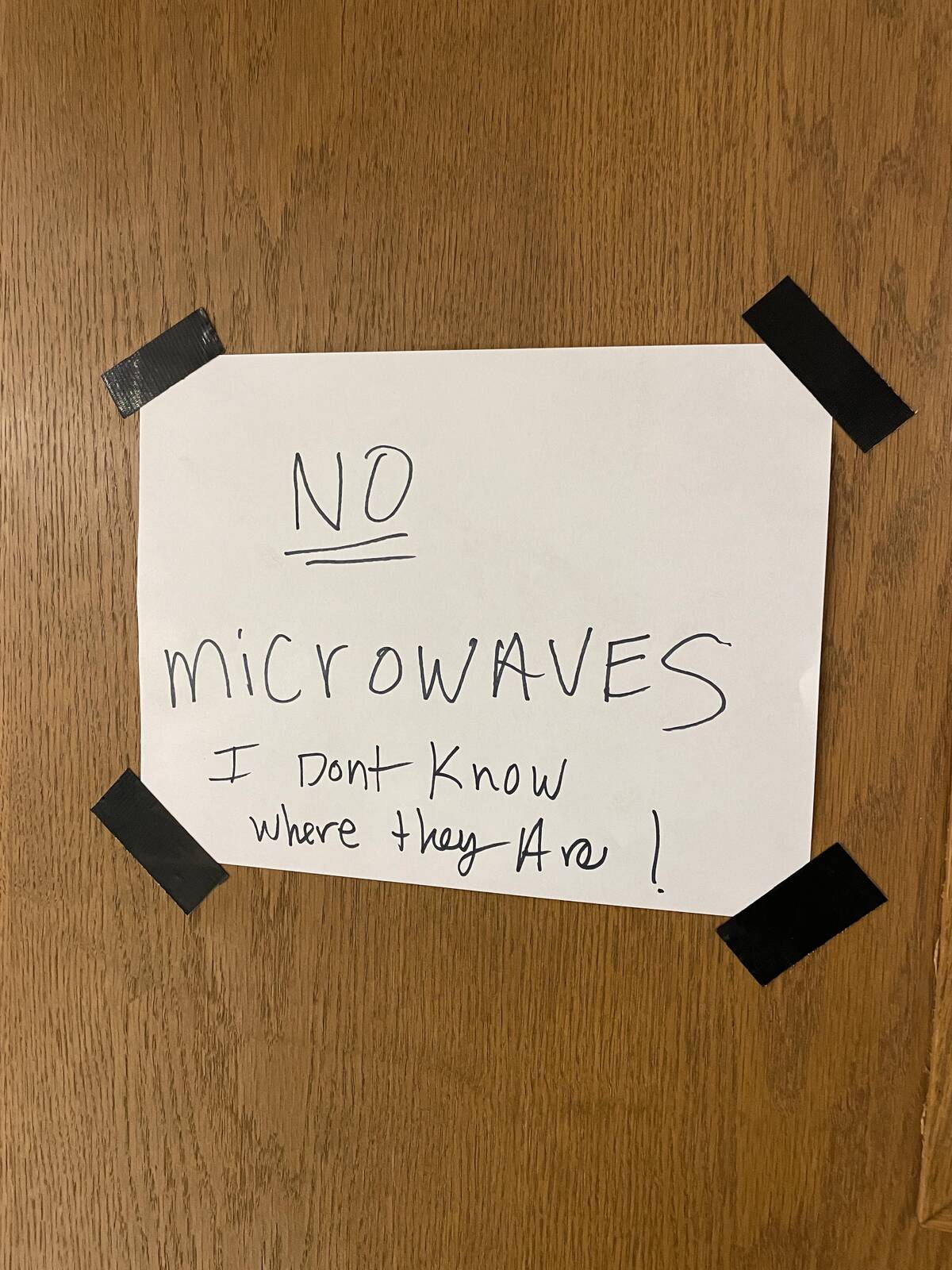 “Encountered this sign at my university this week. Has anyone seen the microwaves?”