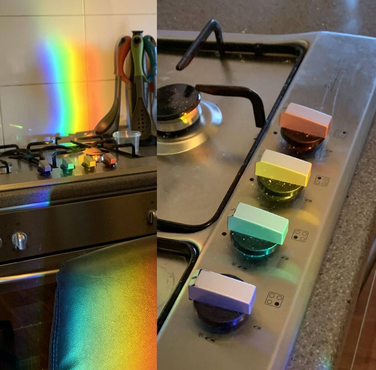 Maybe I’m in a video game, maybe I’m just really into rainbows. The sun hit at the most perfect angle and now my oven knobs look like they got customized in the settings menu. Suddenly, making breakfast feels like casting a technicolor spell in the kitchen.