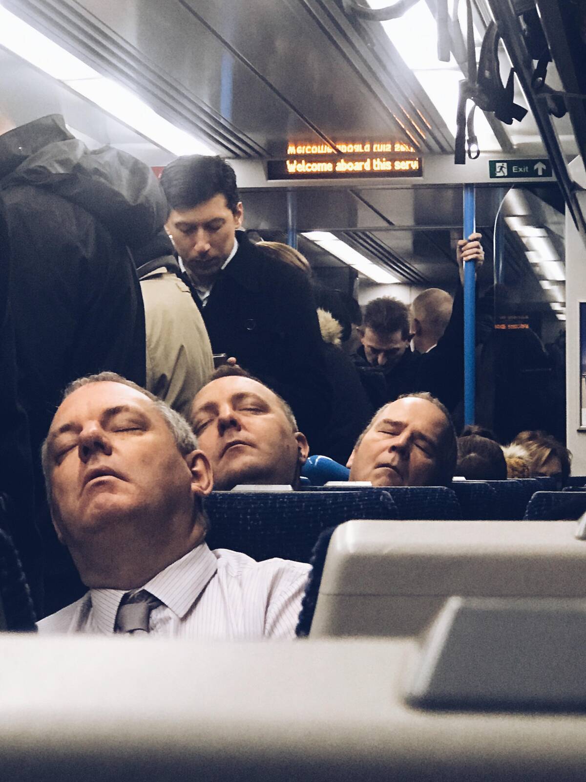 How are these three men all in the same place at the same time? Did I just walk into an alternate reality, or is there a secret clone convention on this train? Honestly, I triple-checked just to be sure. Life has glitched. Again.