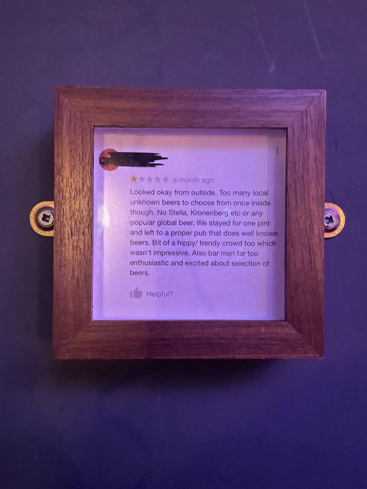 Most businesses hide their bad reviews, but this pub framed theirs with flair. Gotta admire the commitment to local beer—and to having a sense of humor about criticism. Honestly, that bar man’s enthusiasm sounds like a feature, not a bug.