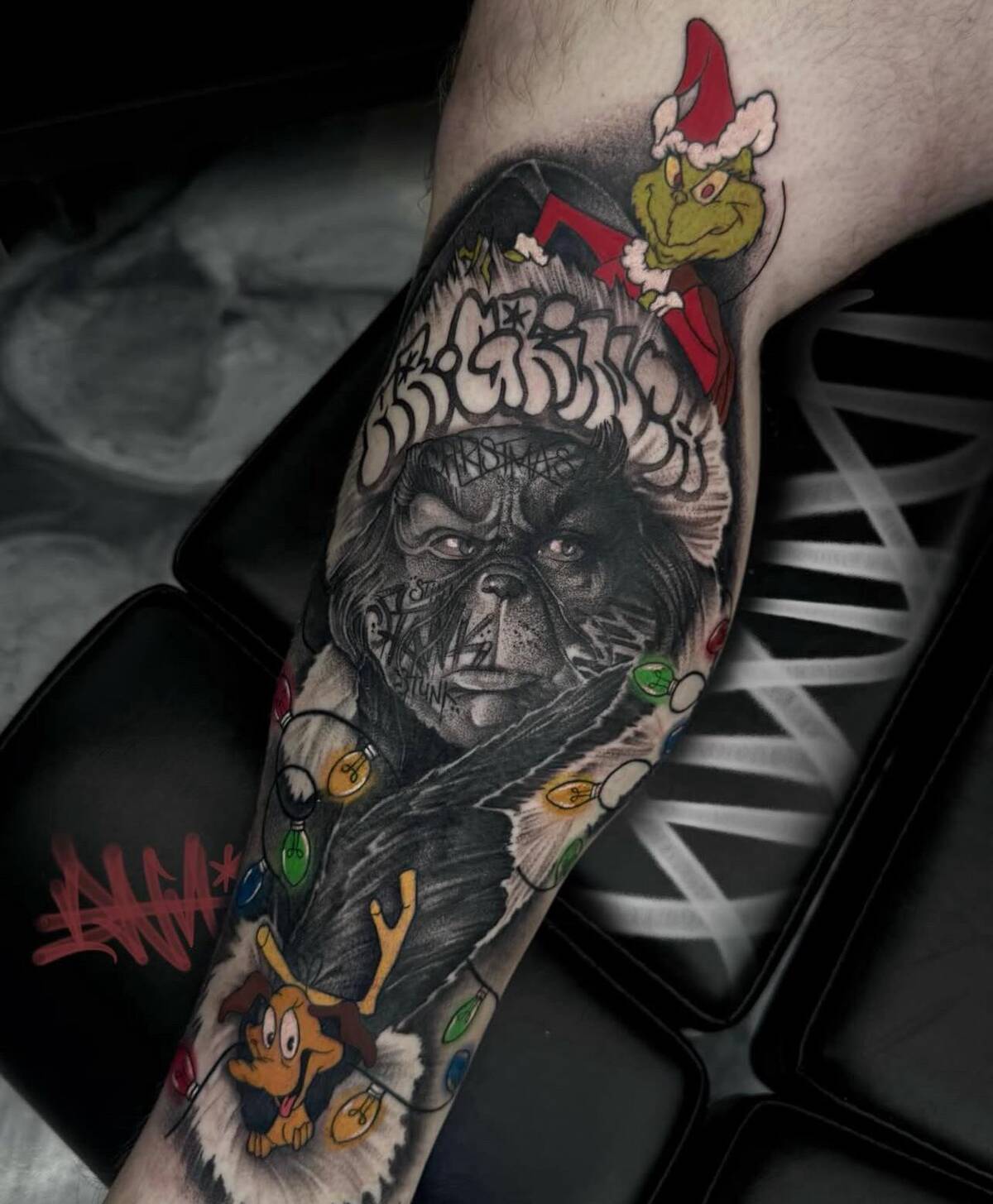 Instagram really said, “You know what you need? This.” Bold tattoo choices meet The Grinch’s sneaky grin—the mashup you never knew existed, but now can’t unsee. This sleeve is a Christmas fever dream and a holiday flex all in one.