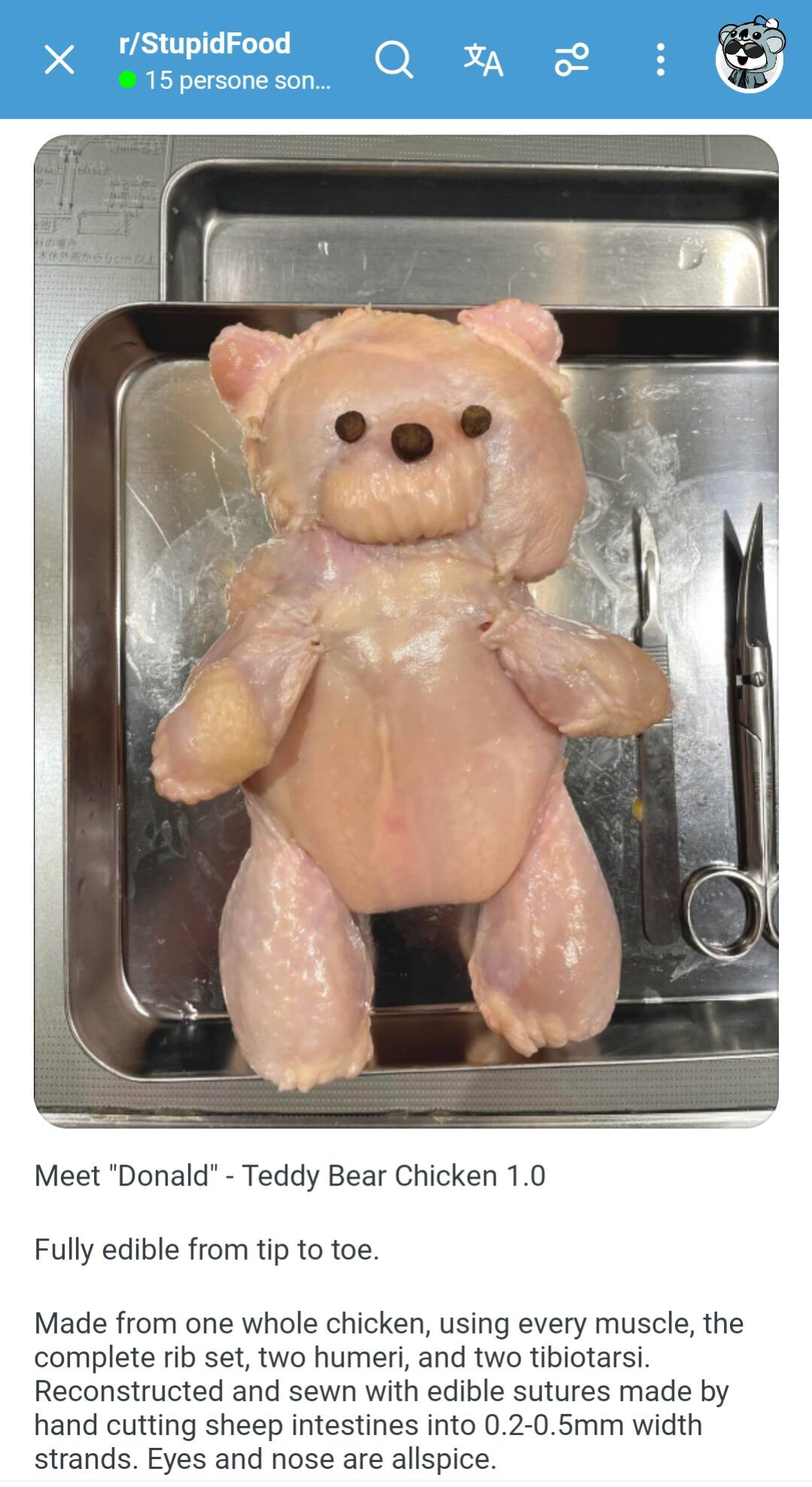 It’s a teddy bear, it’s a chicken, it’s…edible? Mixed feelings don’t even begin to cover it! This is truly at the intersection of cute and uncanny. I’d struggle to take a bite, but hats off to the chef with a wicked sense of humor.