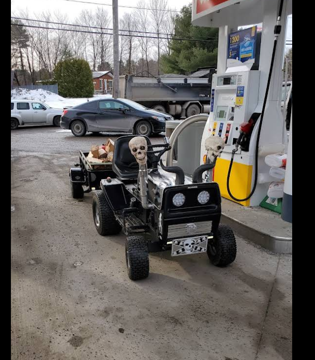 Spotted at the gas station: the only lawnmower doubling as a haunted parade float. The skull accessories are both spooky and hilarious. Forget hot rods—this is the real head-turner at any pit stop. I want to meet the person who rides this and hear their wildest stories.