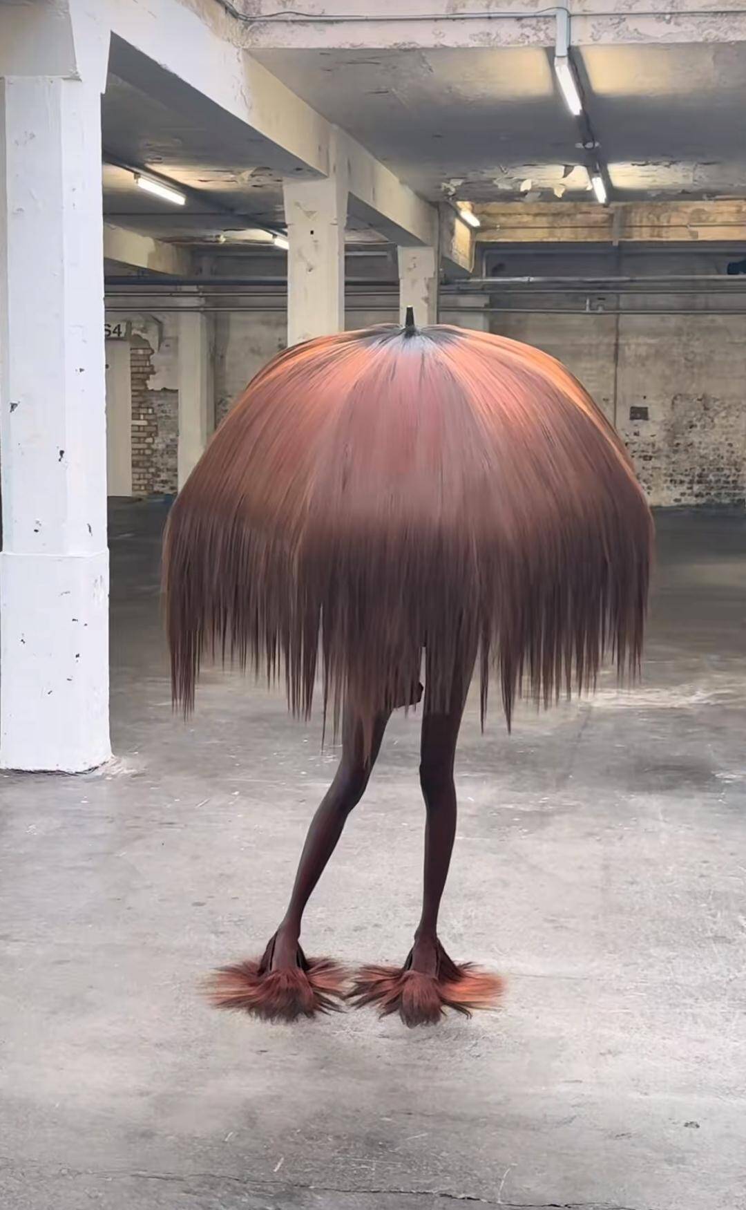 Is it a fashion statement, a disguise, or the next evolution of rain protection? This hair umbrella is giving major Cousin It goes camping vibes. I kind of want to spin around just to see the reactions. The shoes are the cherry on top. I feel like this could storm any runway and traumatize everyone equally.