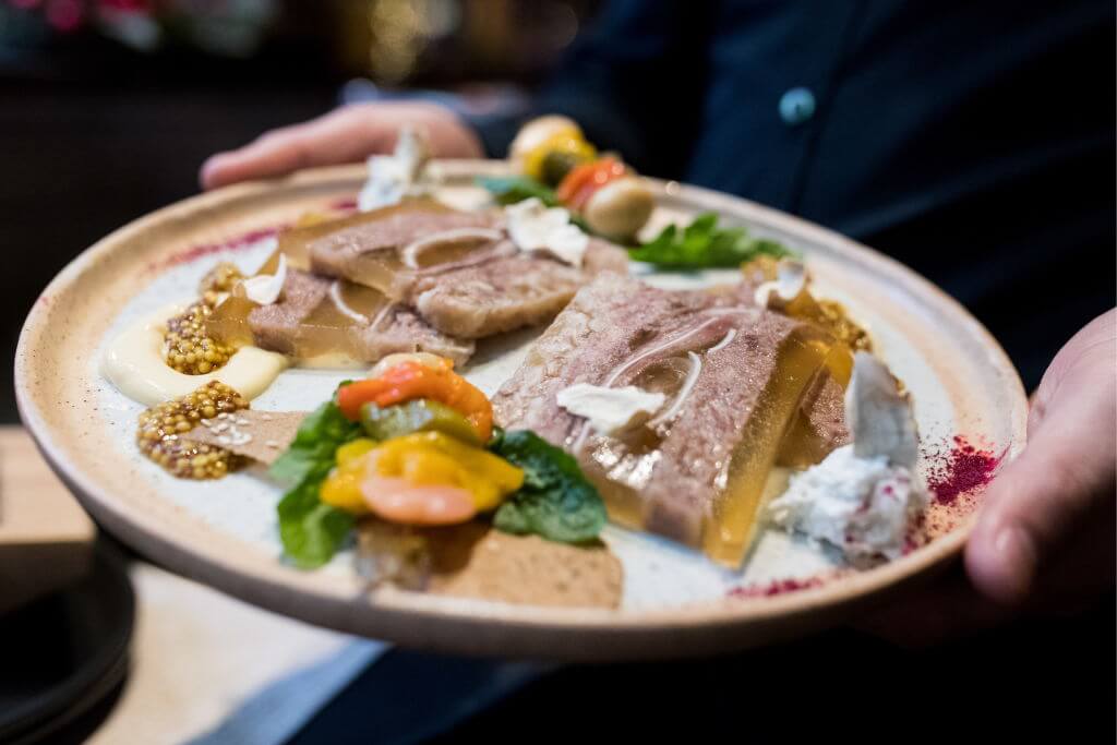 Would you eat this meal? This traditional Russian dish is known as aspic. Aspic is a highly popular dish in the country and contains meat, eggs, and vegetables in a salted gelatin.