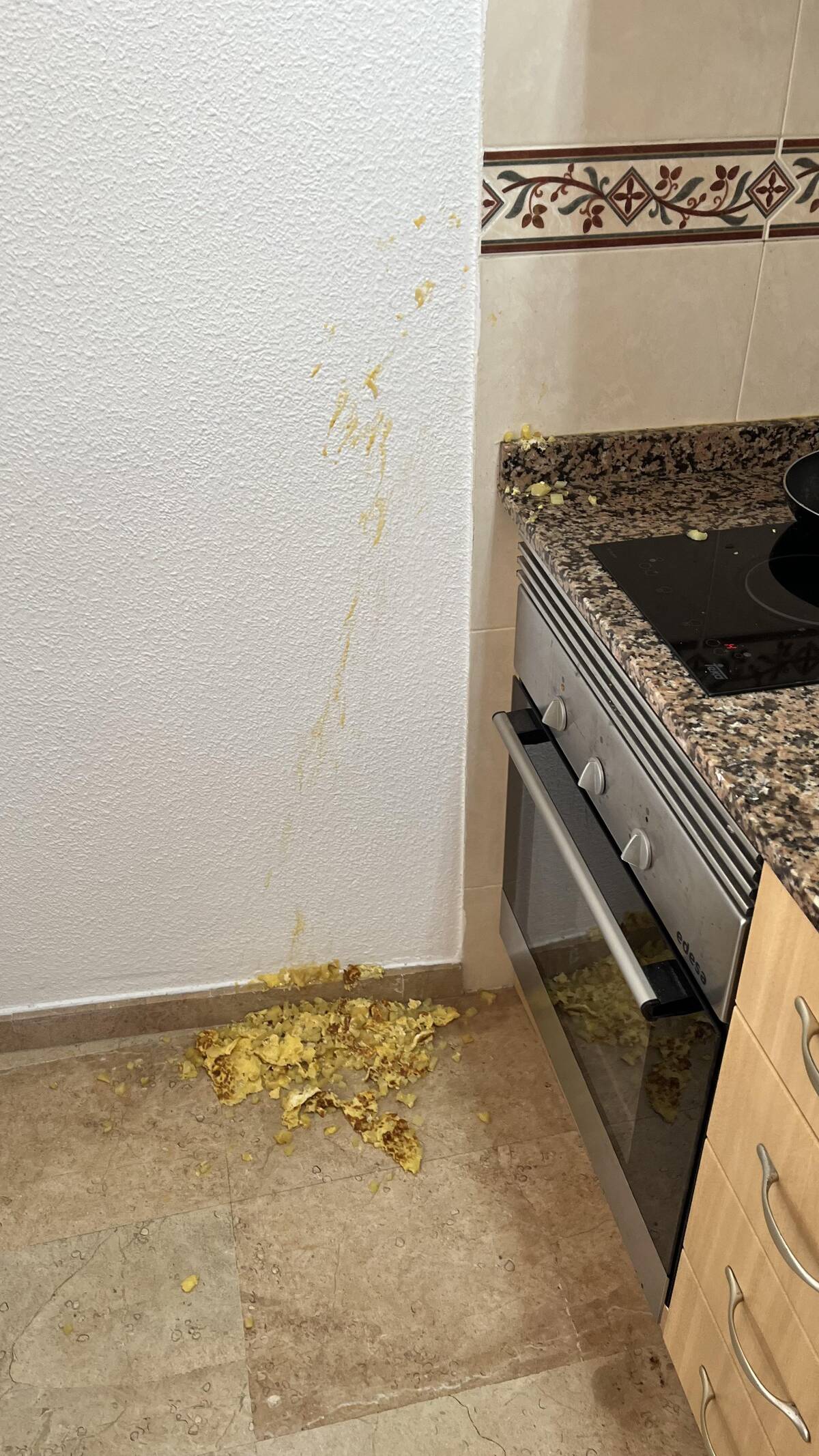 Spanish omelette: 1. Dignity: 0. You flip, you fail, you clean. This kitchen now has a story to tell—and likely a lingering smell of eggs and potatoes. Next time, maybe stick with pancakes.