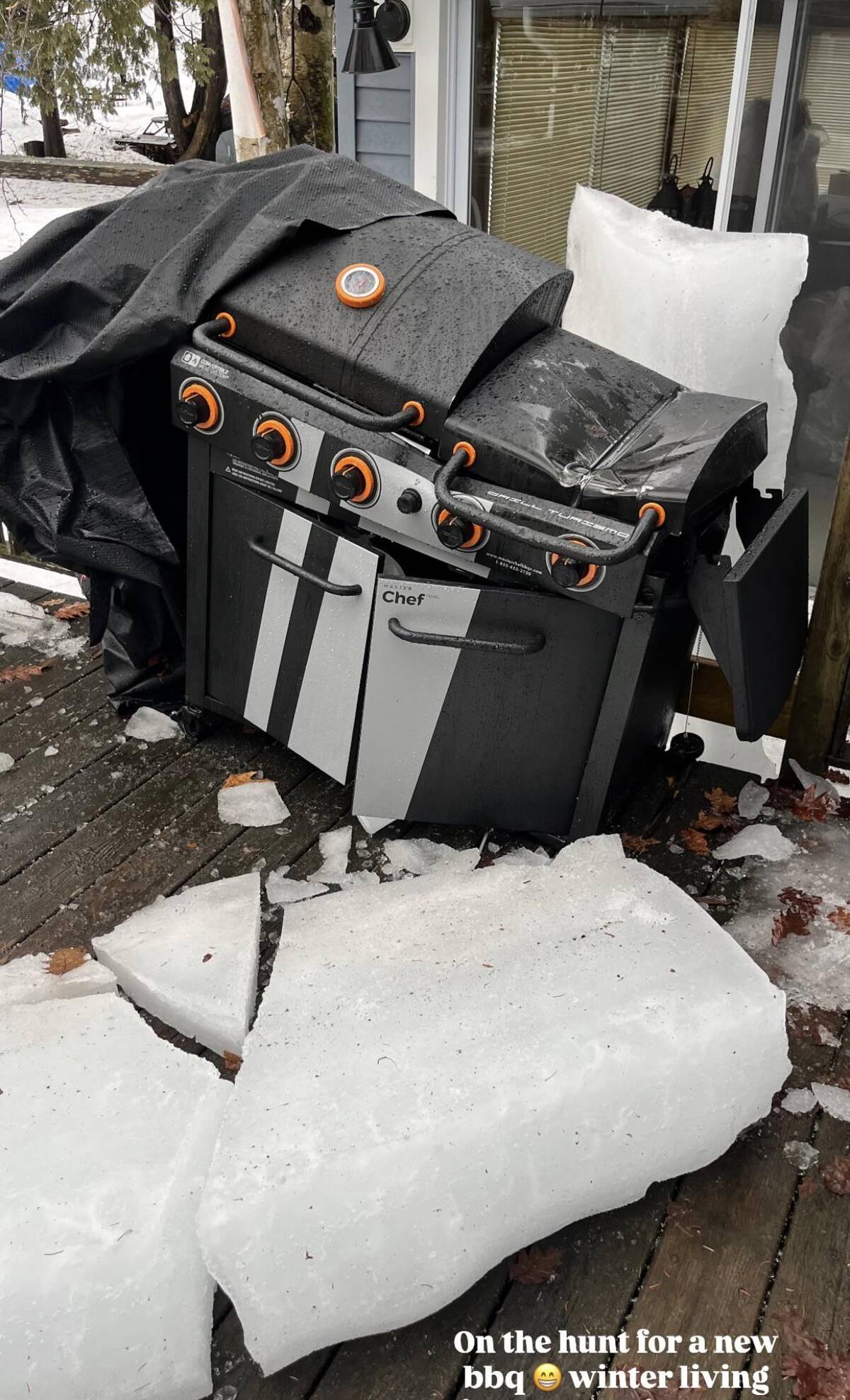 Looks like a snow and BBQ showdown nobody asked for. This is what happens when winter and backyard grilling collide—and it’s not pretty. Back to the drawing board (and possibly the store) for BBQ plans.