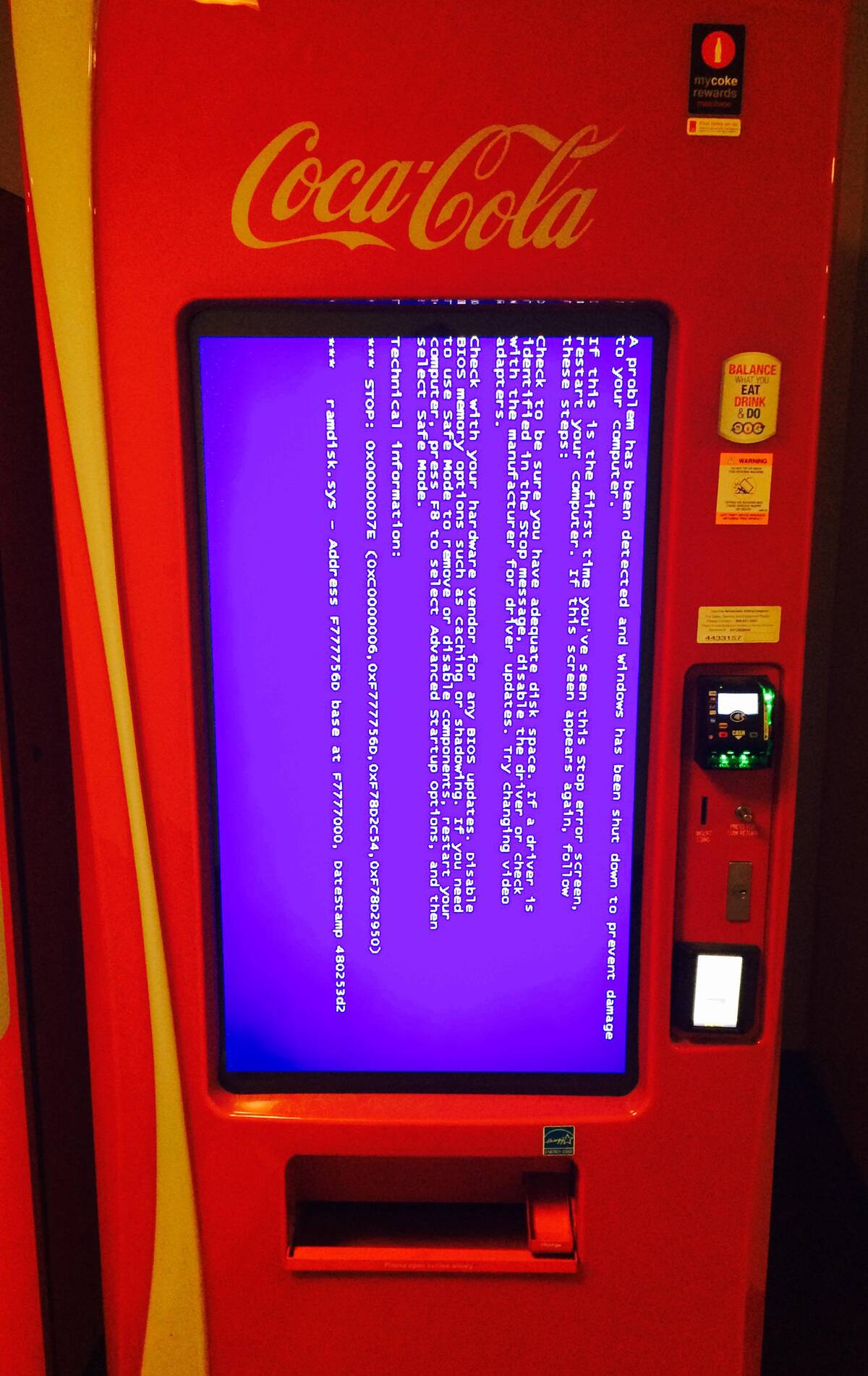 When you just want a soda and the machine hits you with the blue screen of doom. Nothing like thirst and tech frustration coming together in glorious harmony. Guess water will have to do… for now.