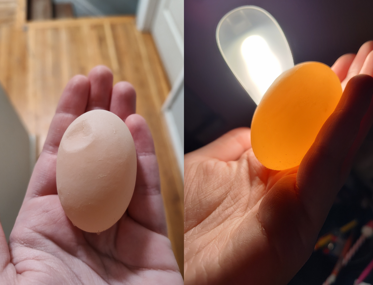 “My 8ish-year-old hen laid this egg with no outer shell and no yolk.”