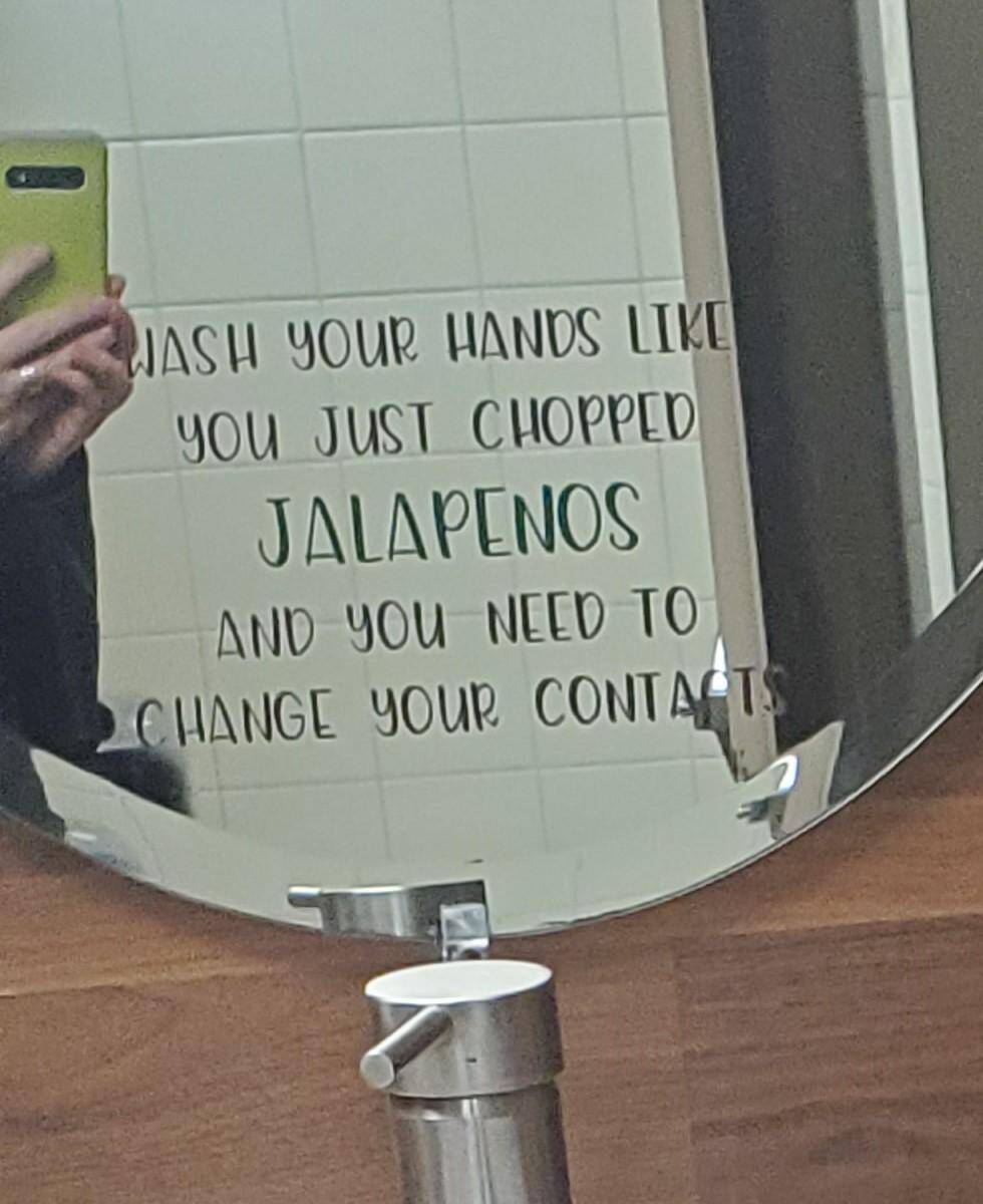 Okay, this bathroom sign is an absolute mood. I didn’t know the threat of jalapeños could be so motivational! That is a public health announcement I can actually get behind. Now every time I wash my hands, you bet I’ll have flashbacks to that one time I sliced peppers without gloves.